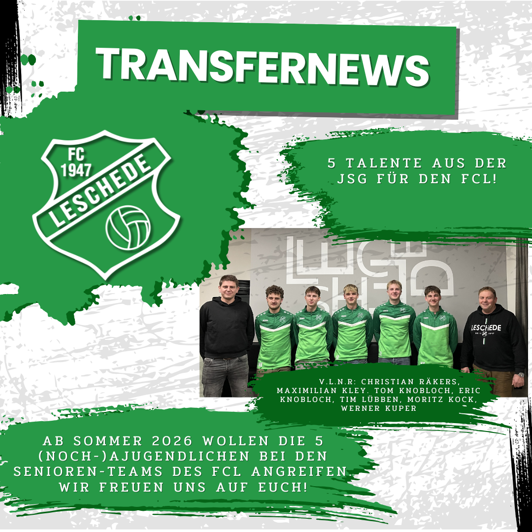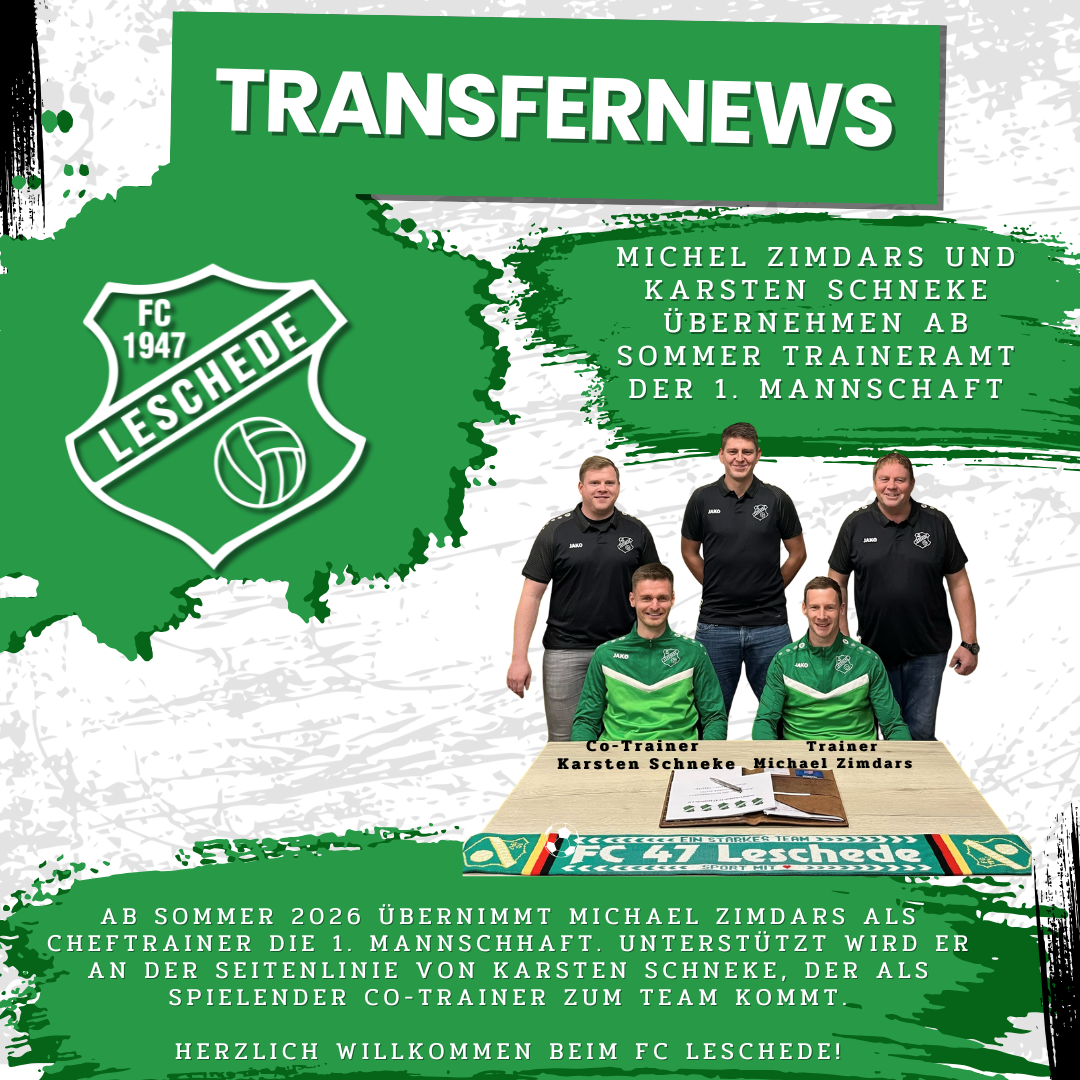 Der FC 47 Leschede wird zur Saison 2026/27 mit einem neuen Trainerteam an den Start gehen. Nach zwei Jahren an der Seitenlinie haben sich der Verein und das Trainerduo Friedhelm „Bobby“ Schüring und Dirk Borg darauf verständigt, die Zusammenarbeit zum Sommer 2026 zu beenden. Aktuell befindet sich die Mannschaft mit 21 Punkten nach 16 Spielen auf dem neunten Tabellenplatz.