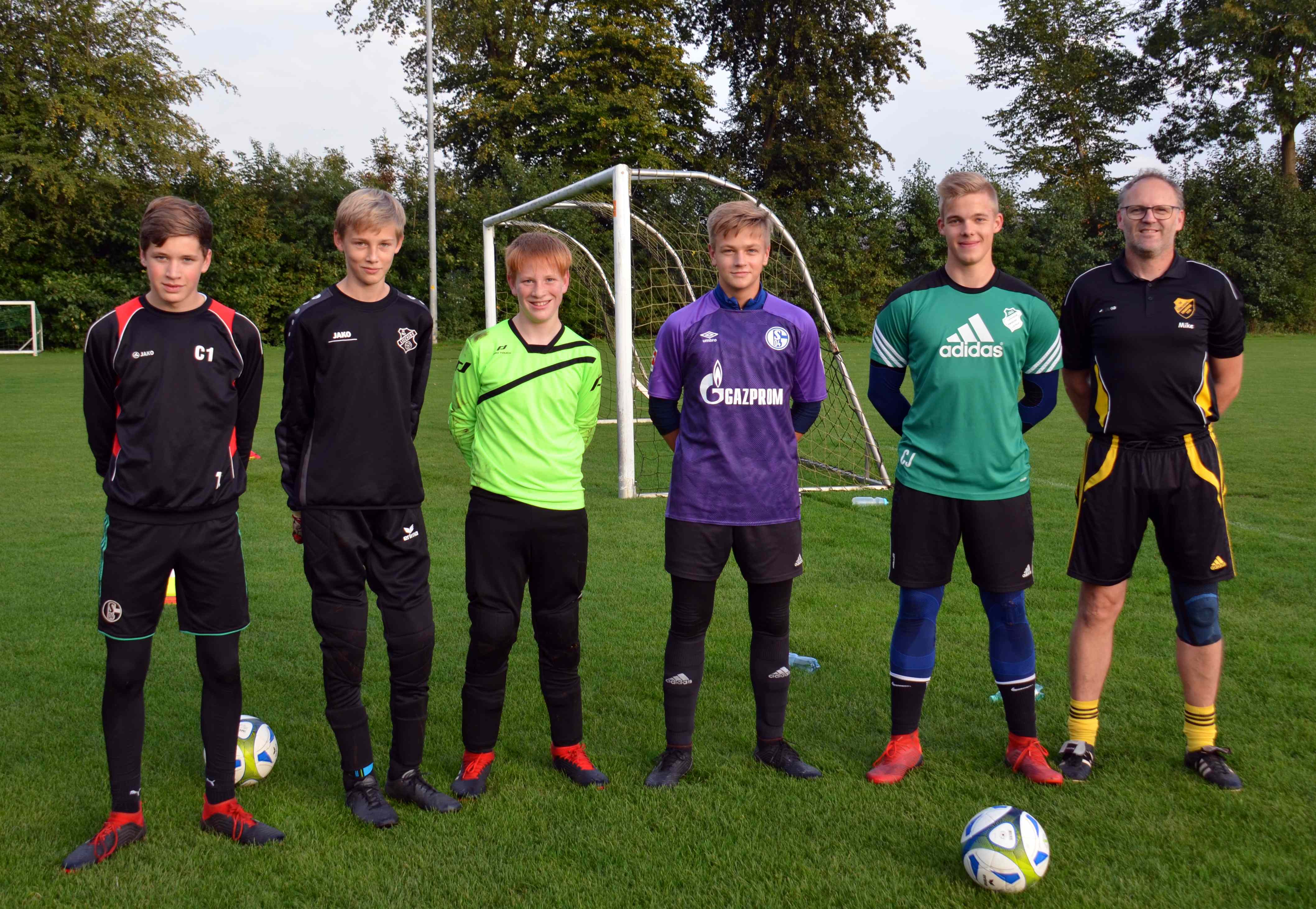 Unsere JSG-Torhüter Henning Feldmann (U17), Luke Hilvert (U15) Marcel Günther (U15), Paul Zwartjes (U19) und Christian Jansen (U19) sowie Torwart-Trainer Mike Sandmann. Es fehlen Julian Albert (U15) und Jannis Drees (U17).
