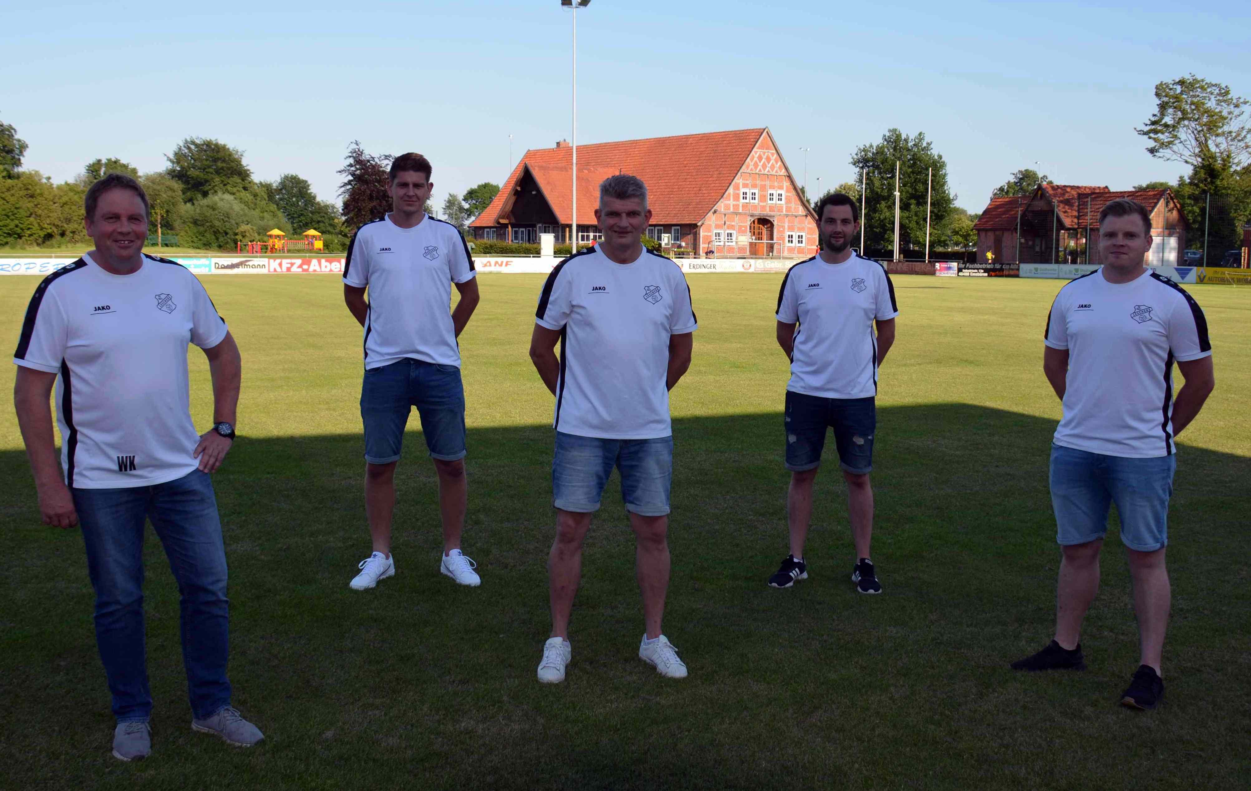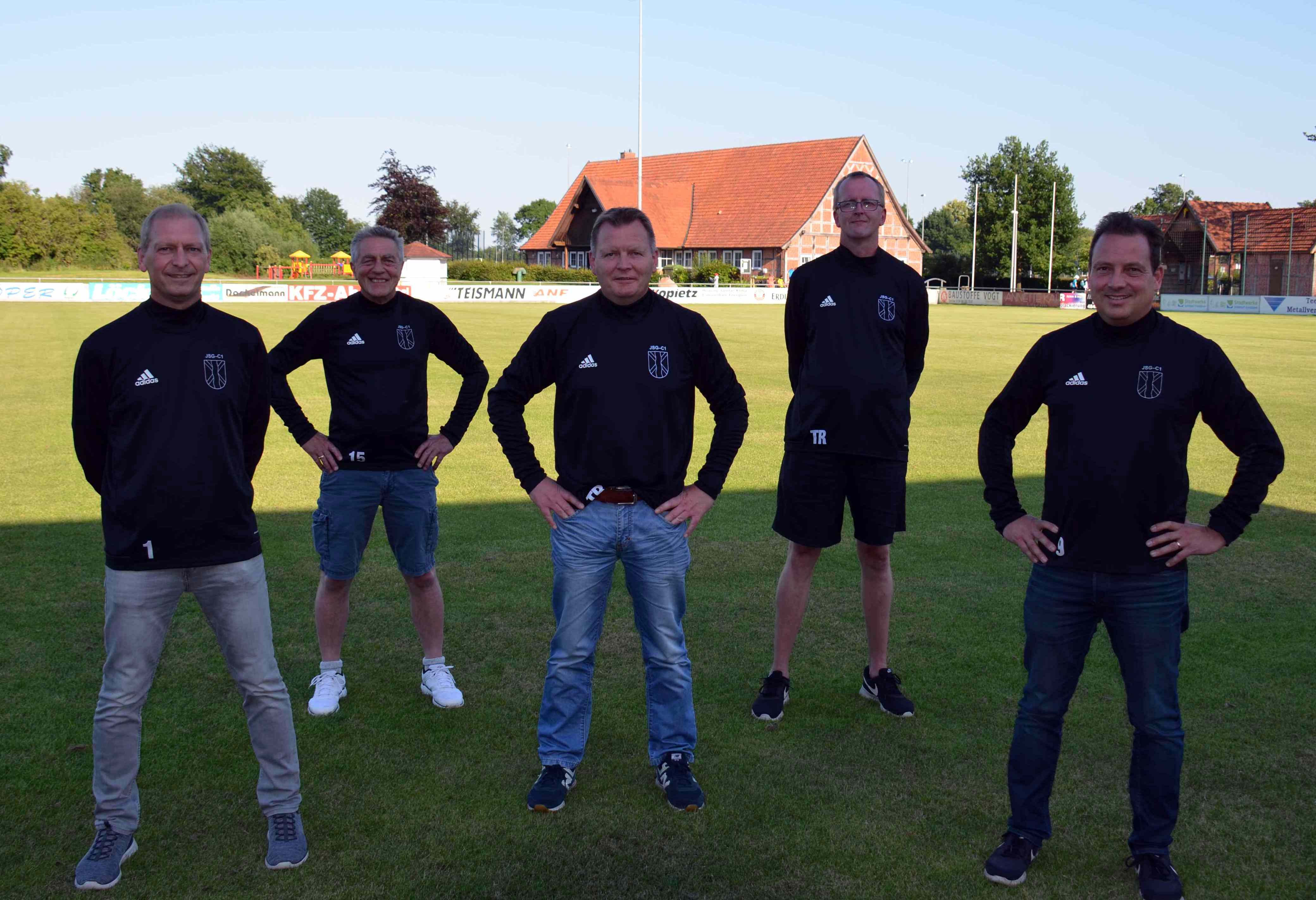 In seine dritte Saison geht bei unserer U17 Bobby Schüring (mitte). Er wird zur kommenden Saison von dem bewährten Team Tim Wolbers (links), Ronny Räkers (zweiter von links) und Patrick Schräer (zweiter von rechts) unterstützt, hinzu kommt zur neuen Saison Werner Kuper (rechts). Auch das Trainerteam der U17 hofft mit der neuen Mannschaft in der Bezirksliga eine gute Rolle spielen zu können. Weitere B-Jugendmannschaften werden die in Leschede spielende B2 in der ersten Kreisklasse und die B3 in der zweiten Kreisklasse sein. Die in Listrup spielende B4 startet ebenfalls in der zweiten Kreisklasse.