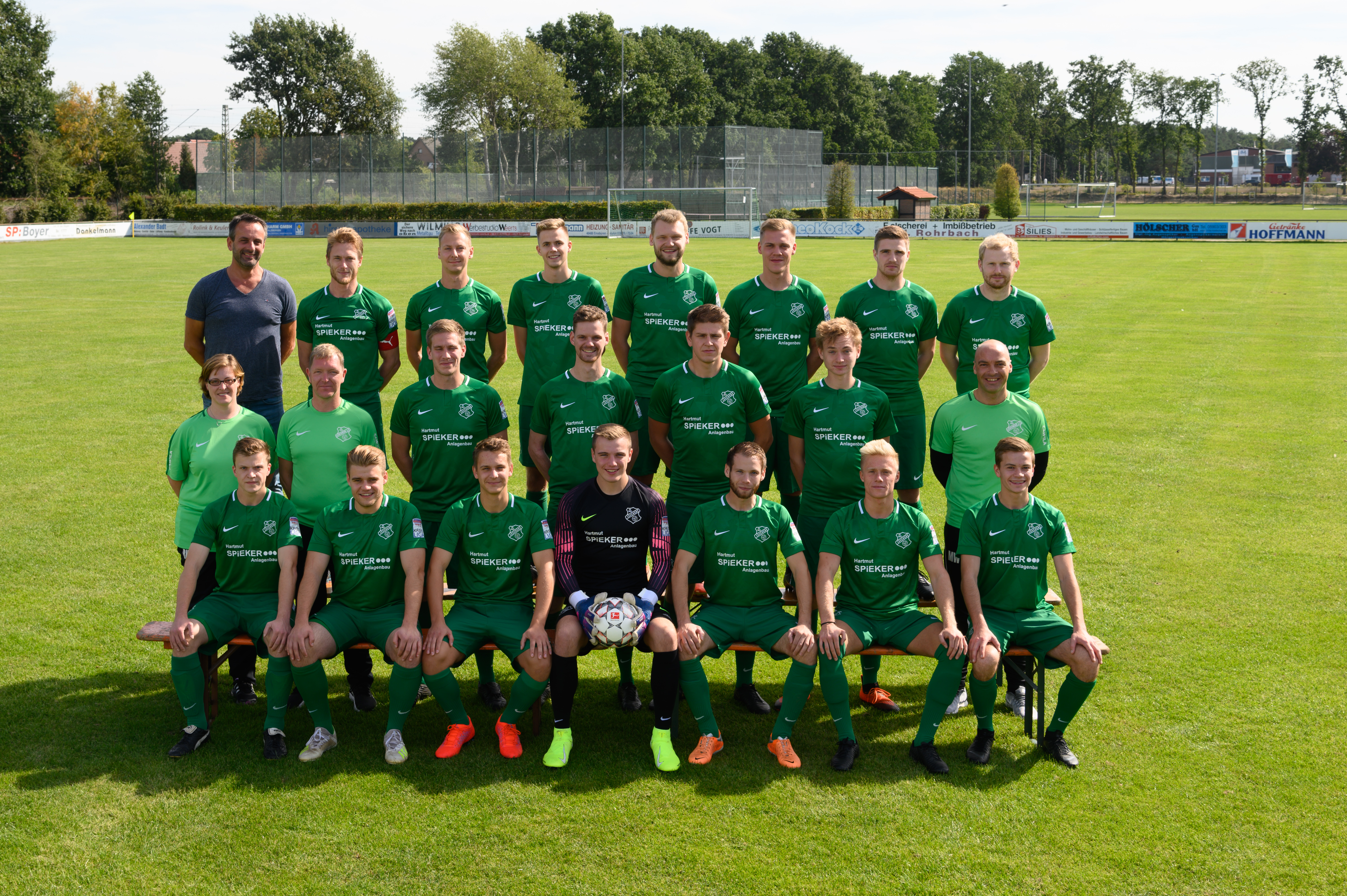 Die Firma Spieker Anlagenbau (Thuine) hat für unsere erste Fußballmannschaft einen Satz neuer Trikots gesponsert. Geschäftsführer Hartmut Spieker (obere Reihe ganz links) übergab die Trikots vor dem Spiel gegen Dörpen an das Team.