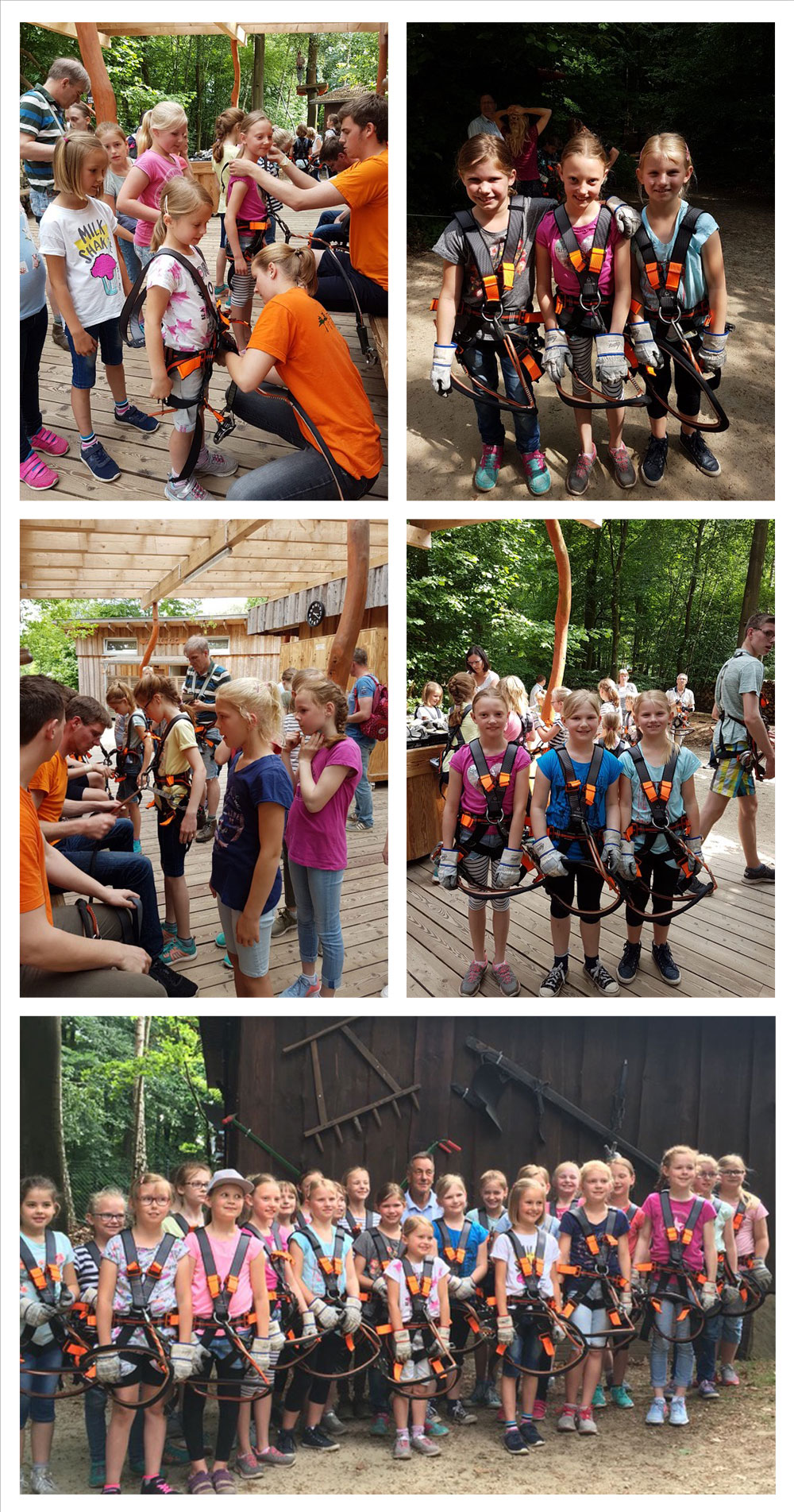 Zunächst wurde das Klettergeschirr angepasst. Neben den beiden Sicherungshaken musste auch der Gebrauch der Rolle erklärt werden; denn ohne die Rolle konnte man nicht per Seilbahn zur nächsten Station kommen. Danach erfolgte die Sicherheitseinweisung, weil das Klettern und Seilbahnfahren in einigen Metern über dem Boden stattfindet. Das Üben der Handhabung der Sicherheitshaken stand als letzter Punkt auf dem Programm der Sicherheitsanweisung. Auch die Größe der Teilnehmer spielt bei der Nutzung der Anlage eine entscheidende Rolle. Denn nur wer eine bestimmte Körpergröße hat, darf die nächst höhere Schwierigkeitsstufe erklimmen.